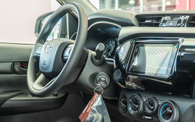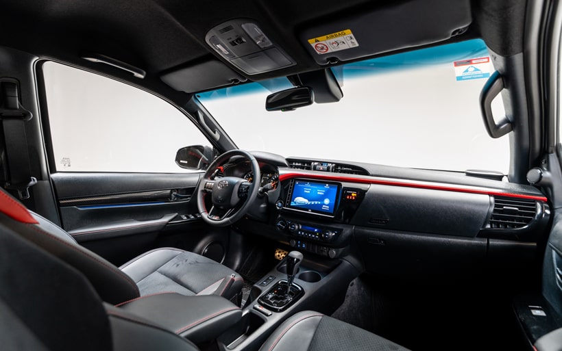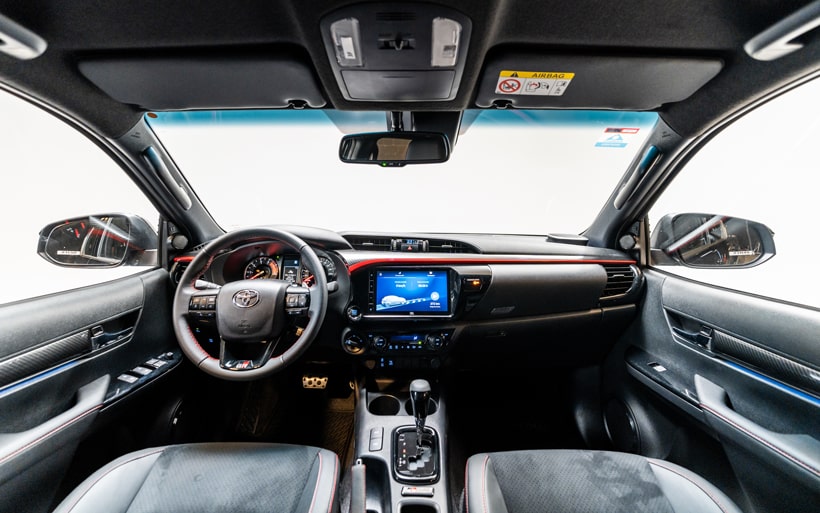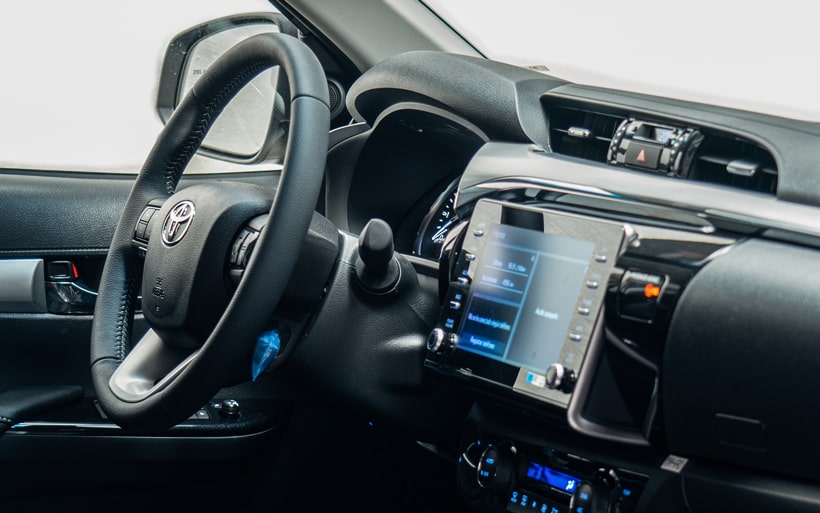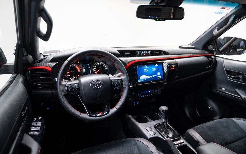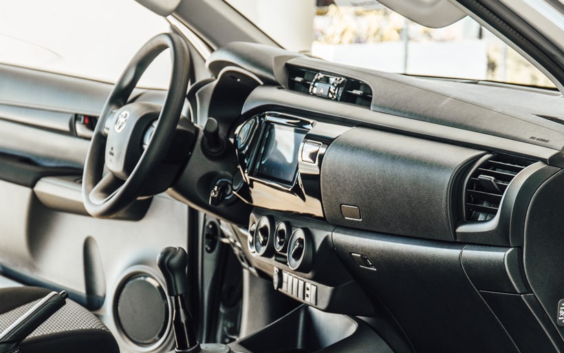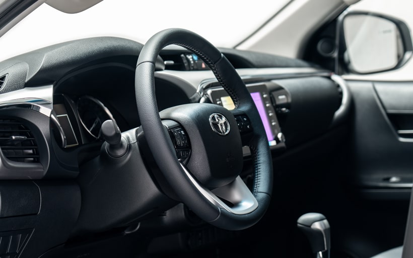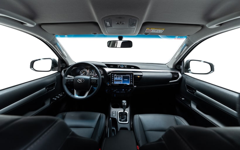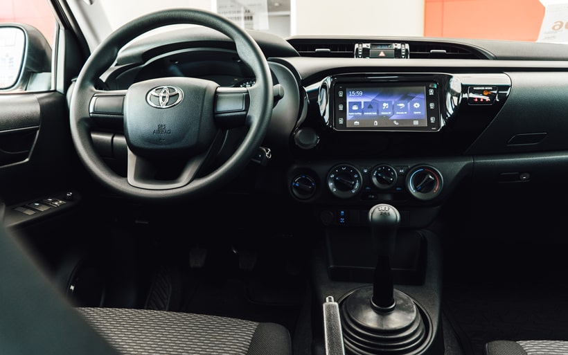 En su interior, la nueva Hilux combina dinamismo y modernidad, integrándose el equipo de audio de manera más fluida al panel de instrumentos. El nuevo diseño y combinación de colores de los relojes de velocímetro y tacómetro, donde predomina ahora el gris, negro y blanco, contribuyen a renovar la atmósfera interior.