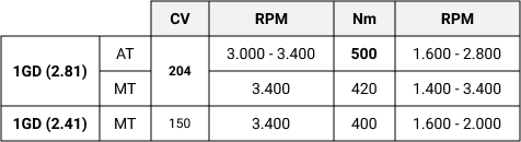 Las versiones de Hilux con motor 1GD (2.8l) tienen ahora 201 CF, incrementando su potencia en un 15%. Las versiones con este motor y transmisión automática tienen ahora 500 Nm de torque.