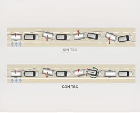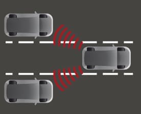 Detecta la posibilidad de una colisión con un vehículo y alerta al conductor con una alarma. Si el conductor no aplica los frenos, el sistema ayuda a evitar o mitigar los daños aplicando un frenado de emergencia.